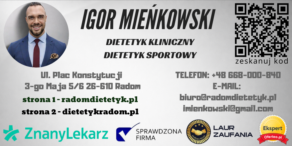 Już od pierwszego kontaktu na wizycie z Panem Igorem Mieńkowskim byłem przekonany, że trafiłem w dobre ręcę. Duża wiedza, profesjonalizm przez duże P, zawsze elegancko ubrany i odnoszący się z szacunkiem do mnie czy innych pacjentów. Dietetyk z powołania dla którego najważniejszy jest człowiek. Na każdej diecie jaką ułożył dla mnie pan Mieńkowski czułem się doskonale. byłem najedzony, energii mnóstwo, do tego poprawila sie koncentracja w pracy i szybkość reakcji. Ciesze się, że moge wystawić pozytywną opinie bo ten dietetyk zasługuje na nią jak nikt inny. Gdybym mógl wystawilbym jeszcze dziesiec takich pozytywnych opinii. Dziękuje zaokazaną mi pomoc będę polecał wszystkim.