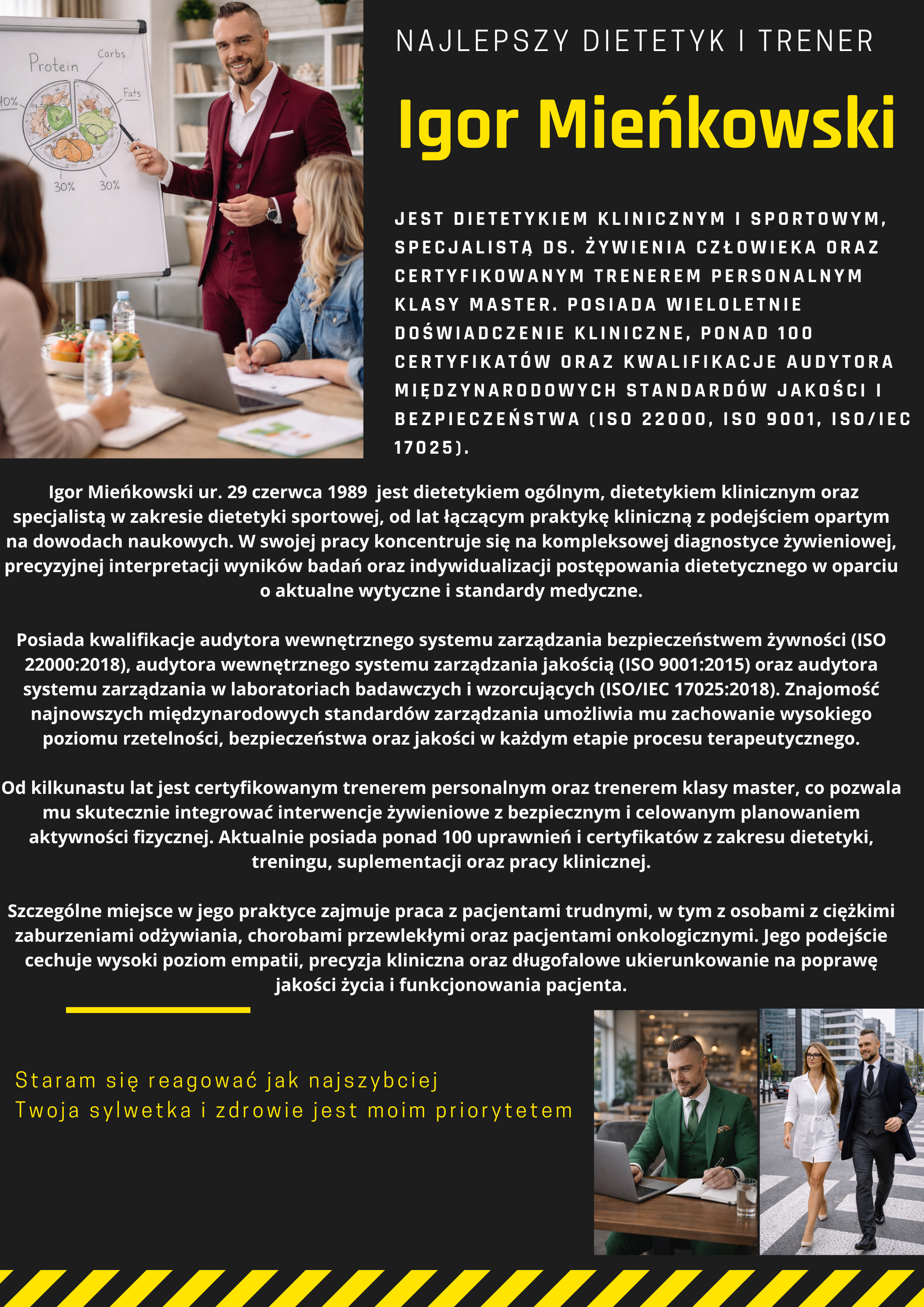 Już od pierwszego kontaktu na wizycie z Panem Igorem Mieńkowskim byłem przekonany, że trafiłem w dobre ręcę. Duża wiedza, profesjonalizm przez duże P, zawsze elegancko ubrany i odnoszący się z szacunkiem do mnie czy innych pacjentów. Dietetyk z powołania dla którego najważniejszy jest człowiek. Na każdej diecie jaką ułożył dla mnie pan Mieńkowski czułem się doskonale. byłem najedzony, energii mnóstwo, do tego poprawila sie koncentracja w pracy i szybkość reakcji. Ciesze się, że moge wystawić pozytywną opinie bo ten dietetyk zasługuje na nią jak nikt inny. Gdybym mógl wystawilbym jeszcze dziesiec takich pozytywnych opinii. Dziękuje zaokazaną mi pomoc będę polecał wszystkim.