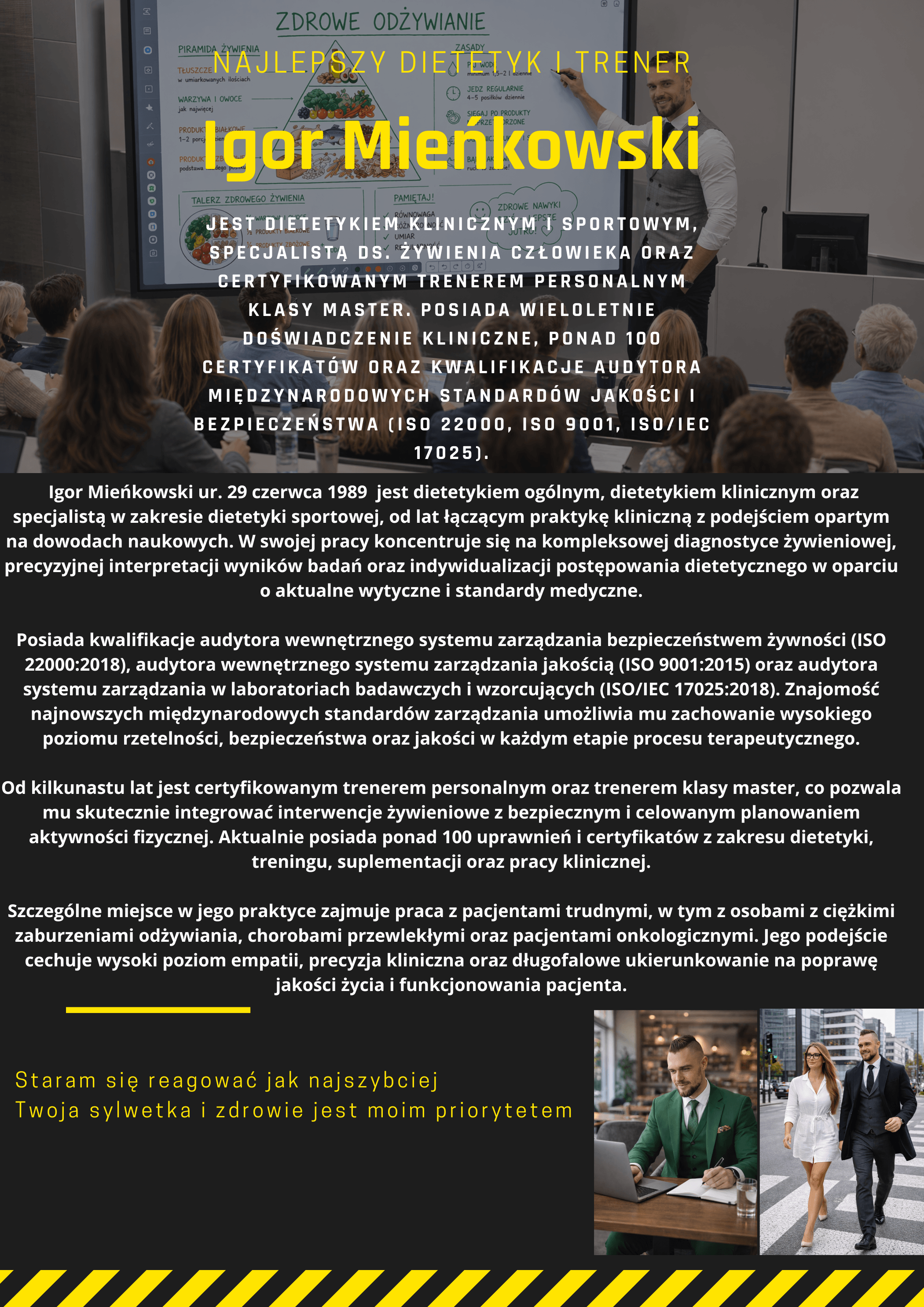 Już od pierwszego kontaktu na wizycie z Panem Igorem Mieńkowskim byłem przekonany, że trafiłem w dobre ręcę. Duża wiedza, profesjonalizm przez duże P, zawsze elegancko ubrany i odnoszący się z szacunkiem do mnie czy innych pacjentów. Dietetyk z powołania dla którego najważniejszy jest człowiek. Na każdej diecie jaką ułożył dla mnie pan Mieńkowski czułem się doskonale. byłem najedzony, energii mnóstwo, do tego poprawila sie koncentracja w pracy i szybkość reakcji. Ciesze się, że moge wystawić pozytywną opinie bo ten dietetyk zasługuje na nią jak nikt inny. Gdybym mógl wystawilbym jeszcze dziesiec takich pozytywnych opinii. Dziękuje zaokazaną mi pomoc będę polecał wszystkim.